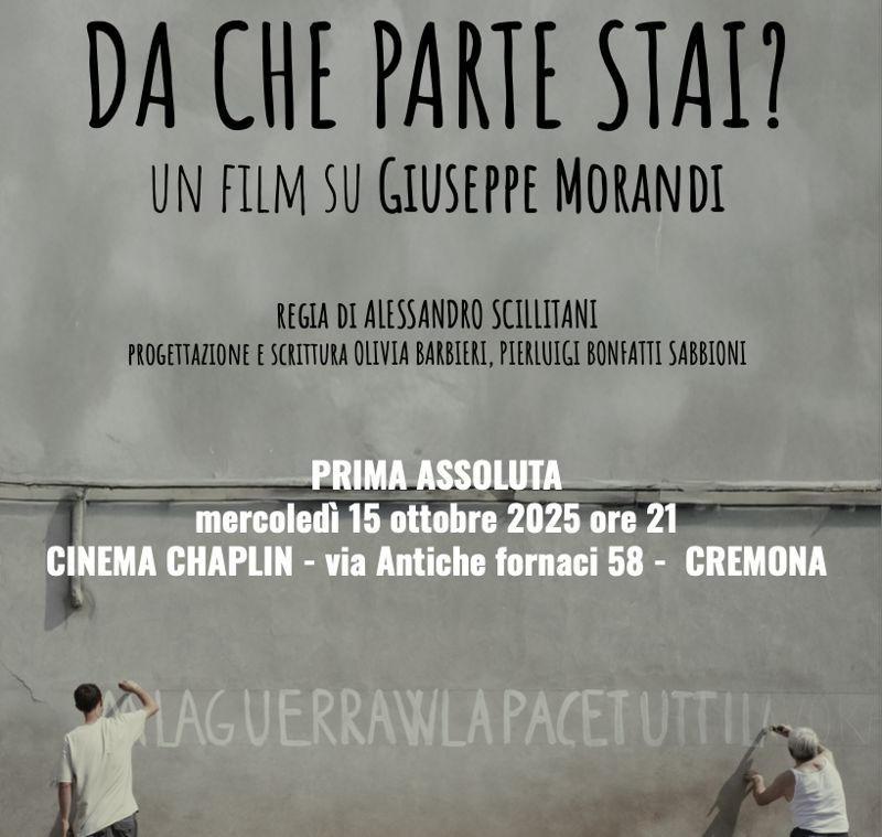 Mercoledì 15 Ottobre si terrà una serata molto importante con la presentazione, a ingresso libero, del documentario “Da che parte stai?”, dedicato al fotografo, regista e artista Giuseppe Morandi, fondatore della Lega di Cultura di Piadena. L'intento dell'opera, nata da un gruppo di amici di Morandi proprio al CineChaplin, realizzata dal Regista Alessandro Scillitani e sostenuta dalla Provincia di Cremona, è restituire, almeno in parte, il suo straordinario impegno e la passione profusa per raccontare il mondo dei paìsan e le trasformazioni della bassa padana dal dopoguerra ad oggi. Il film è arricchito dalle voci di intellettuali, amici e compagni di strada, capaci di restituire la profondità di un percorso umano e artistico. Il trailer è reperibile al link YouTube