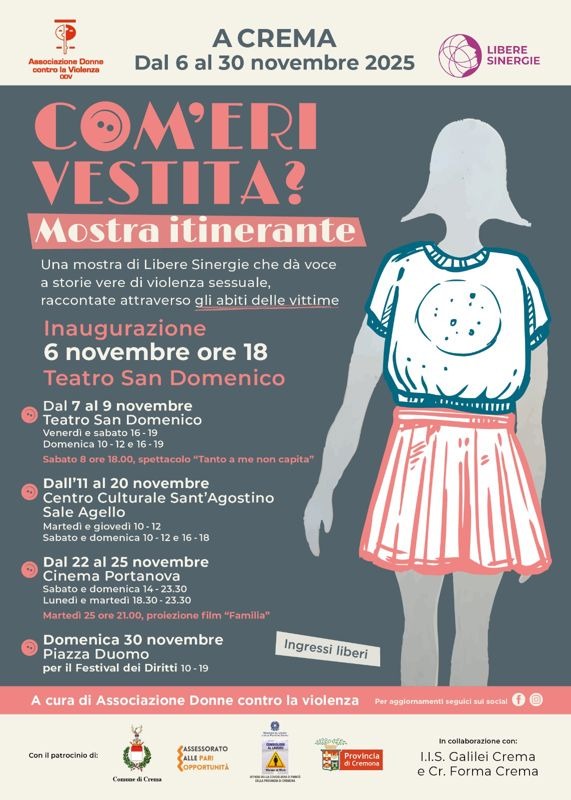 "Com'eri vestita?", inaugurata a Crema la mostra itinerante contro i pregiudizi di genere e la violenza sulle donne. Per sfatare il mito che l'abbigliamento di una donna giustifichi un'aggressione