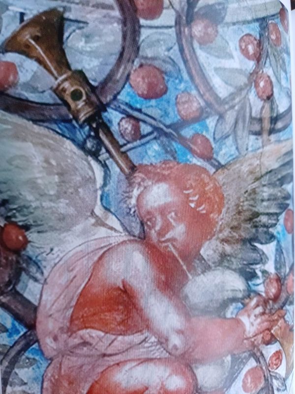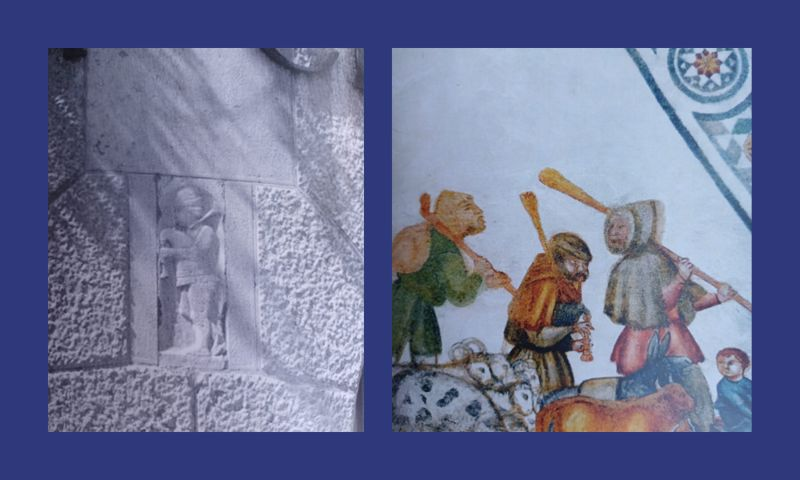 Nelle foto la copertina del libro e la sfilata di Heart of Italy Pipe Band, poi la formella di piazza del Comune con il suonatore di zampogna nel transetto sud della Cattedrale di Cremona (fine XV secolo) e l'angelo con la zampogna di Santa Maria delle Grazie a Soncino (1530 circa)
