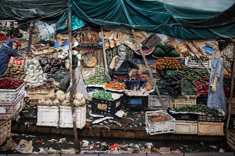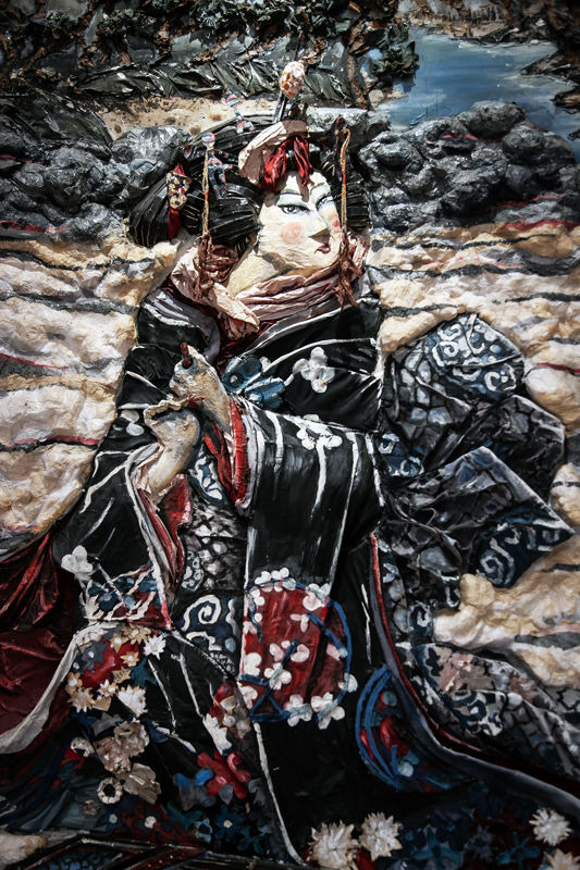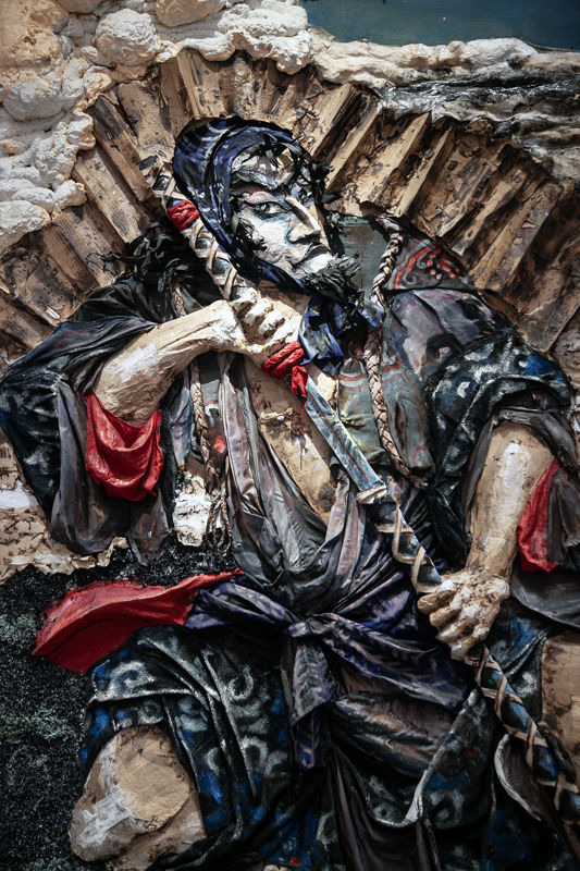 Tra le opere, i “Saltatori” emergono come immagini archetipiche. Figure colte nell’istante più fragile e potente: quello del salto. Non un gesto atletico, ma esistenziale. Il momento in cui si lascia una soglia per entrare nell’incertezza. In queste figure si condensa una tensione profondamente contemporanea: il coraggio di attraversare il vuoto. Accanto a loro, una costellazione di presenze: venditori, geishe, samurai, santi. Figure che sembrano lontane, ma che parlano del nostro tempo. Il quotidiano si fa simbolo, come nella grande tela del mercato nordafricano, dove la realtà si espande fino a diventare monumento umano. Poi, al centro, la presenza fisica della scultura: il San Michele Arcangelo: ferro, carta, stoffa. Un corpo nello spazio che non rappresenta soltanto, ma esiste. Che costringe lo spettatore a confrontarsi non con un’immagine, ma con una presenza.