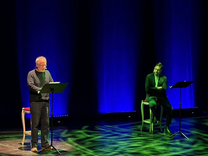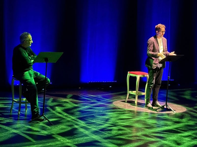 In questo scarto si è inserito con forza, quasi con necessità, lo spettacolo I confini non esistono, andato in scena questa sera al Teatro Ponchielli di Cremona, prevedibilmente semivuoto per la coincidenza con il più appetibile Festivalone nazionale. Chi si aspettava un dialogo strutturato è forse rimasto spiazzato: più che un confronto, abbiamo assistito a un ping pong tra Stefano Mancuso, neurobiologo botanico di fama mondiale e docente all’Università di Firenze, e Matteo Caccia, autore, podcaster e voce radiofonica. Nessuna scenografia, nessuna azione drammatica, nessun artificio teatrale: solo la scarna presenza della parola.