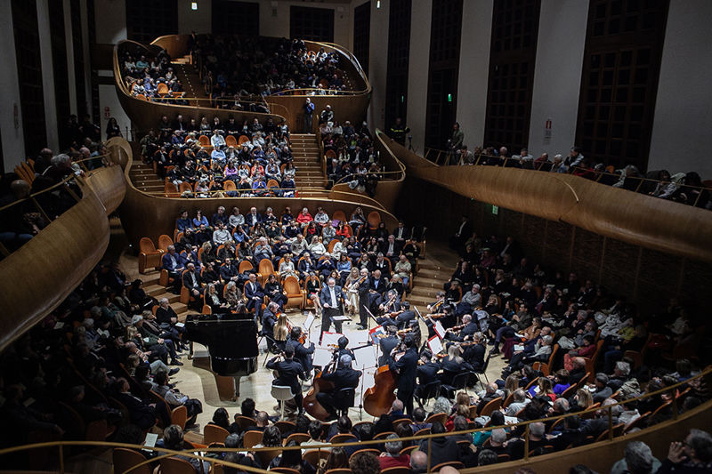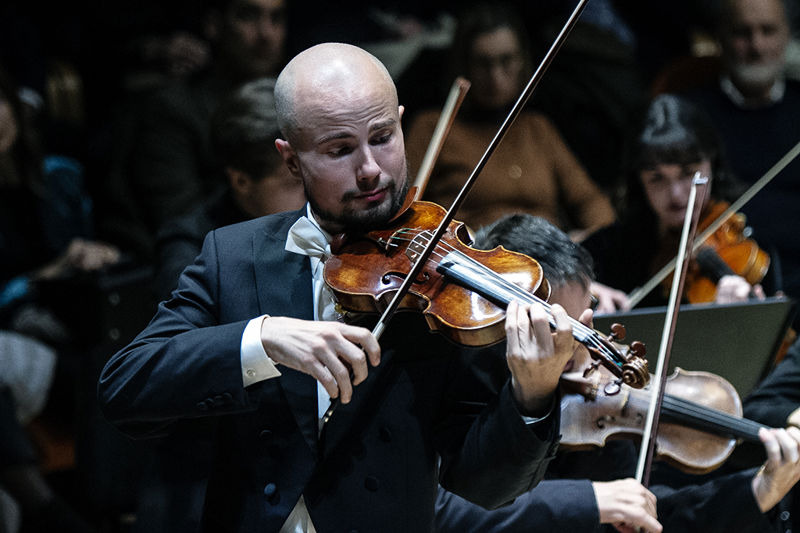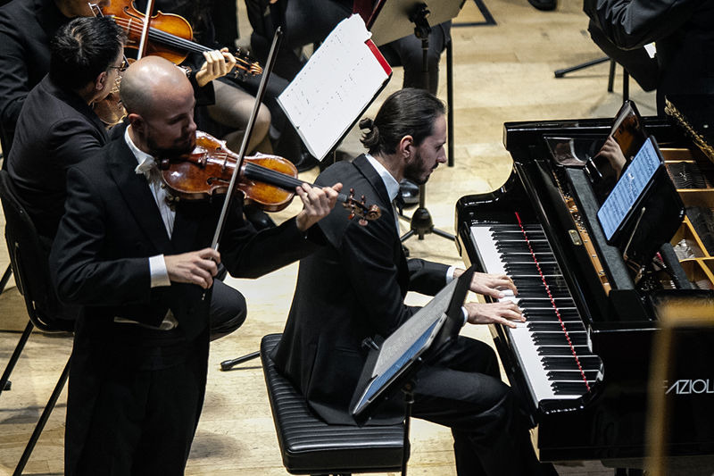 Del resto, per tutto il corso della serata la singolarità di Gianluca ha avuto una rappresentazione, ben più che metaforica, nelle due cadenze dei movimenti Allegro e Adagio Adagio del Concerto in sol maggiore per violino e orchestra K 216 di Wolfgang Amadeus Mozart (trascritta per orchestra d’archi). Peripezie tecniche. Funamboliche ricerche sonore. Fantasmagoriche atmosfere dello Stradivari: Omobono 1730 “Accademia” hanno scolpito l’immagine di un campione che, certo sapeva fare squadra, ma che il colpo decisivo per la vittoria era, sempre e solamente. il suo. La sua invenzione. Il suo singolare argomentare agonistico in mezzo ad altri 21 uomini. Ed è qui la differenza. E come sempre c’è però la squadra. In questo caso l’ Accademia Concertante d’Archi di Milano, guidata dal Maestro Mauro Ivano Benaglia. Un complesso d’archi solido. Creatore di un suono che vibra. Che lascia in molti passaggi incantanti; frutto di una cura tecnica meticolosa. Di una preparazione singola che non ammette critiche. Di una passione intensa di Benaglia. Lui dirige con il cuore. Con l’anima. Lo fa sentire ai suoi archi che lo recepiscono creando un perfetto meccanismo tra severa interpretazione della partitura e profondo senso interpretativo che non difetta a Benaglia sia nelle arditezze mozartiane; brano già vistosamente (nonostante il numero relativo basso di catalogo) maturo nel lessico del salisburghese. Un plauso ancora più grande perché nella concertazione l’assenza dei fiati non ne fa diminuire il valore. E lo stesso cuore è nella pregevolissima pagina di Ferenc Farkas e della sua Partita all’Ungaresca per orchestra d’archi nei movimenti: Basse danse · Gagliarda · Passamezzo · Saltarello · Intermezzo · Heiduckentanz. Scelta felice. Intelligente. Pezzo che unisce che gli stilemi delle antiche danze rinascimentali e barocche con il vigore folklorico delle melodie magiare. L’ Allegro del Concerto doppio in re minore (violino, pianoforte e orchestra) di Felix Mendelssohn – Bartholdy ha chiuso il programma ufficiale. Altro pezzo complesso dove il compositore tedesco ha unito miracolosamente le tipicità della sonata per violino e pianoforte con gli stilemi del concerto solistico. Chapeau, non solo ai due solisti ma soprattutto a Benaglia che fuso il linguaggio di Mendelssohn con sapienza, ma soprattutto con una musicalità potente.