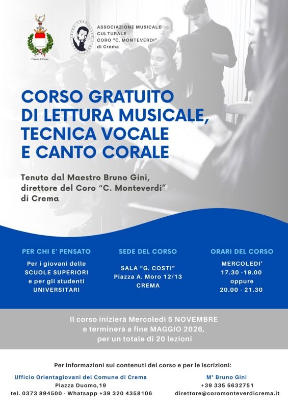 Imparare a leggere la musica, applicare tecniche vocali e avvicinarsi al canto corale: queste le competenze che potranno acquisire i fruitori del corso gratuito organizzato dal Comune di Crema con l'Associazione Musicale Culturale Coro "Claudio Monteverdi". L'iniziativa formativa è rivolta agli studenti delle scuole superiori e agli studenti universitari e il programma prevede 20 lezioni, con inizio mercoledì 5 novembre e termine nel maggio 2026.