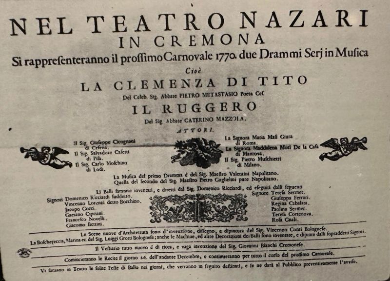 Wolfgang Amadeus Mozart a Cremona non ebbe solo la folgorazione di strumenti musicali perfetti, ma ricorda alla sorella (Lettera da Milano il 26 gennaio 1770) anche quest’opera che lui stesso avrebbe musicato La clemenza di Tito K 621, su libretto di Caterino Mazzolà, nel settembre del 1791; morirà a dicembre di quello stesso anno. E qui ci fu l’incontro con l’opera seria, al teatro Nazari, firmata da un compositore della scuola napoletana, una delle principali di quel periodo: Michel Angelo Valentini. Autore nato nel primo ventennio del XIX secolo, fu allievo nei Conservatori napoletani di Sant’Onofrio e della Pietà dove insegnava Leonardo Leo; un vero e proprio gigante della scuola partenopea. Dopo aver svolto il ruolo di organista alla Cappella Reale di Napoli, dove era anche stato Maestro di Cappella, si traferì a Bologna da quel Padre Giovanni Battista Martini che Mozart incontrerà nella primavera del 1770.