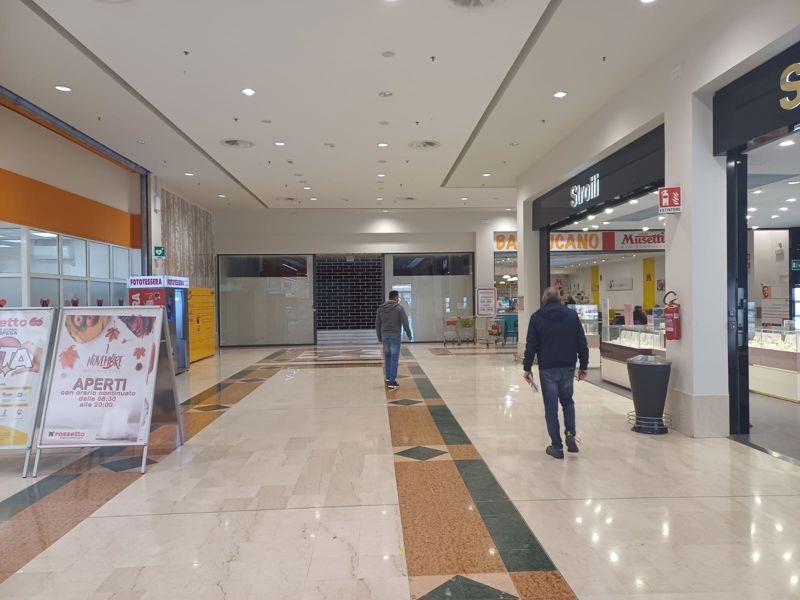 Nelle foto il negozio OVS con il cartello del "fuori tutto", "The Corner" chiuso, Aris abbigliamento con la saracinesca abbassata dentro la galleria commerciale e l'annuncio dell'apertura di IVIA Milano