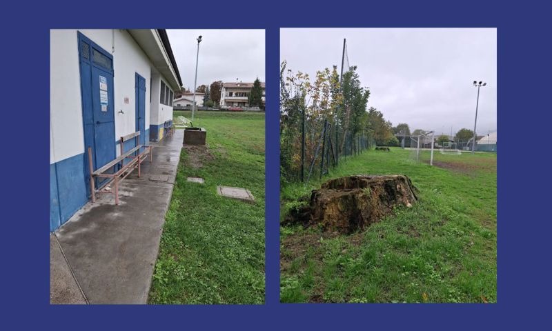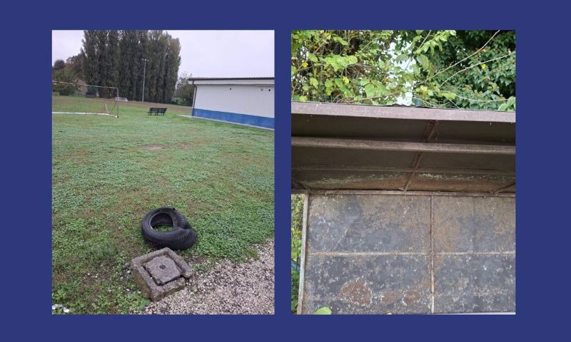 L’impianto comprende un campo da calcio a 11 e due campi da calcetto, uno coperto e uno scoperto, ma le condizioni generali sono preoccupanti: le panchine del campo da calcio esterno sono rotte e completamente arrugginite, compromettendo il decoro e ponendo rischi igienico-sanitari a danno degli atleti; gli spogliatoi, con docce e bagni, versano in condizioni di forte degrado; lungo i bordi del campo si trovano tronchi tagliati e residui legnosi pericolosi per chi utilizza l’impianto; all’interno dell’area sportiva sono presenti carcasse di copertoni abbandonati,