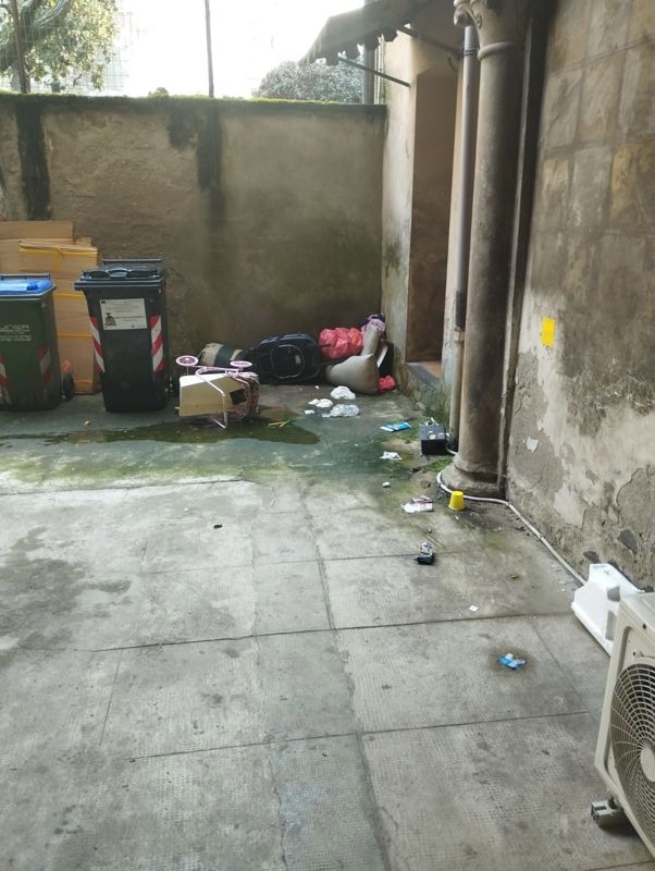 Casa Sperlari: come nei migliori film horror, anche la carrozzina per le bambole gettata nell'androne tra cumuli di rifiuti. Non appena ripulito, lo spazio torna ad essere una discarica