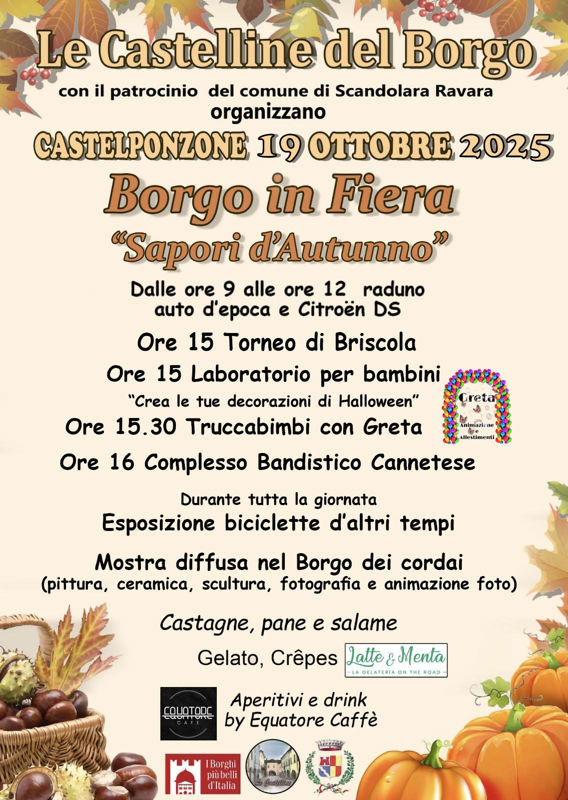 Nel pomeriggio è di nuovo il Borgo di Castelponzone al centro delle attività, con la gara di briscola ed il laboratorio di halloween per bambini dalle 15.00, truccabimbi dalle 15.30 e alle 16.00 l'esibizione del Corpo Bandistico Cannetese. Durante tutta la giornata sarà possibile ammirare l'esposizione di biciclette d'altri tempi, mentre prosegue anche per il secondo weekend la mostra diffusa "Artisti nel Borgo", promossa dall'associazione Castelletto dei Ponzoni, che trasforma i luoghi iconici del borgo in un museo all'aperto.