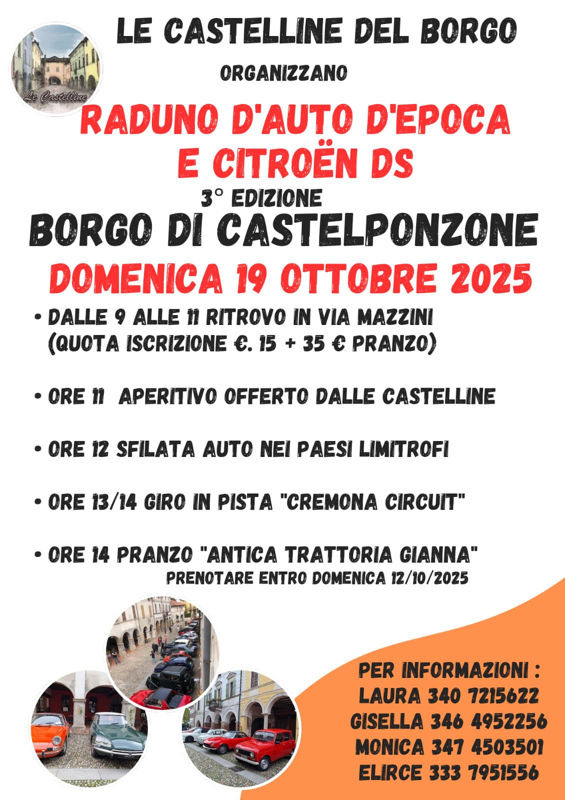 La fiera patronale torna anche quest'anno ad animare il borgo di Castelponzone, proponendo una serie di iniziative messe in campo dal gruppo delle "Castelline del Borgo", con l'intento di far rivivere ai 'castellini' la storica Fiera di San Luca, che ricorreva proprio la terza domenica di ottobre. "Borgo in Fiera - Sapori d'autunno" è il nome scelto per l'appuntamento di domenica 19, che propone una ricca varietà di iniziative di intrattenimento: si parte la mattina, dalle 9.00 alle 12.00, con il raduno di auto d'epoca e Citroen DS, con ritrova a partire dalle 9.00 in via Mazzini per l'iscrizione, mentre alle 11.00 scatta l'ora dell'aperitivo offerto dalle "Castelline" mentre alle 12.00 inizierà la sfilata delle auto nei paesi limtrofi, per arrivare infine al Cremona Circuit dove dalle 13.00 alle 14.00 per l'emozione di un giro in pista; infine, dalle 14.00 piloti e passeggeri a tavola per il pranzo presso l' "Antica Trattoria Gianna".