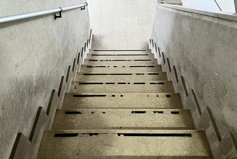 Ma non sono solo le tubazioni a dare problemi alla struttura, dove in molti punti gli intonaci dei soffitti sui vari piani stanno cedendo, creando ampie chiazze scoperte, dove anche le armature metalliche risultano esposte alle intemperie, col rischio, oltre che di cadute di altri calcinacci, anche di aggravare la situazione strutturale del piano. "Il grattacielo è in condizioni imbarazzanti. Si salvano, con meno criticità, il seminterrato e il terzo piano. - commenta un nostro lettore - Ingresso, primo e secondo piano sono un insidia forte soprattutto per le persone anziane: la pavimentazione è completamente bagnata, macchie di umidità e di muffa ovunque, scale quasi prive delle protezioni in gomma antiscivolo. Ci saluta un cartello con la scritta “Attenzione pavimento scivoloso” che suona quasi come una beffa".
