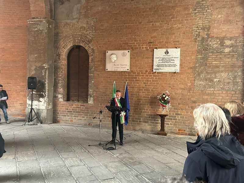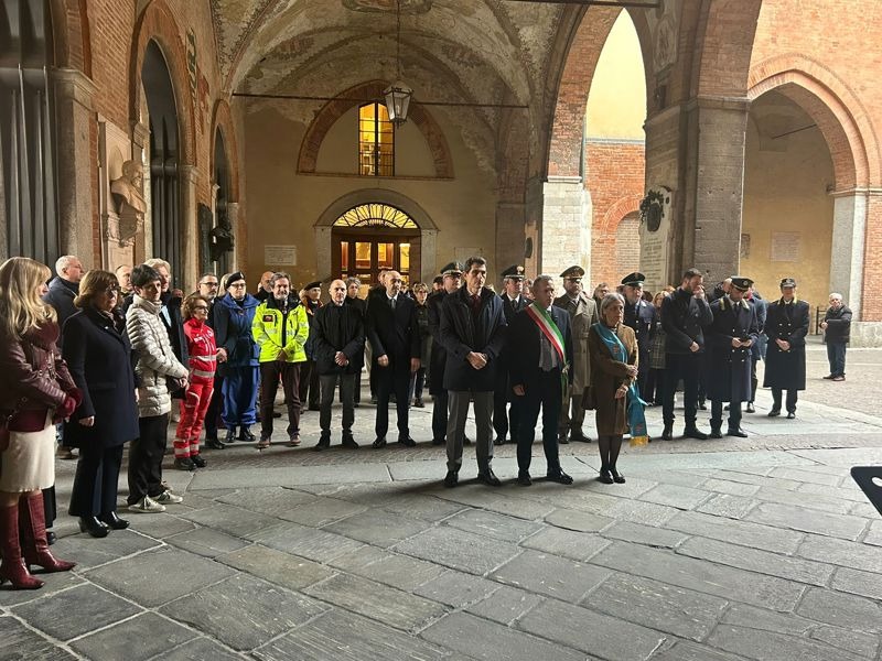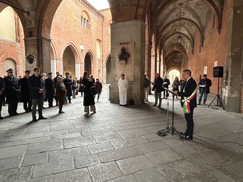 La cerimonia si è aperta con un minuto di silenzio in ricordo delle vittime. Dopo la benedizione del mazzo di fiori posto sotto la targa commemorativa e un momento di preghiera a cura di don Davide Barili, parroco di S. Sebastiano e Vicario episcopale per il clero, è seguito l'intervento del sindaco Andrea Virgilio: "Oggi siamo qui per ricordare chi non c'è più. Per dare nome, volto e piena dignità a una ferita che ha attraversato le nostre famiglie, la nostra città, la nostra comunità. Non ricordiamo soltanto un tempo difficile. Ricordiamo persone. Ricordiamo vite. Ricordiamo assenze che hanno lasciato un segno profondo. E ricordiamo anche che, in quei mesi, tutto ciò che ci sembrava ordinario, all'improvviso, non lo era più. Le sirene, in quei giorni, hanno cambiato il suono della città. Segnavano il tempo dell'emergenza e ci riportavano continuamente a una verità che faticavamo ad accettare. C'era il bollettino dei contagi e delle vittime. Ogni sera. Numeri che diventavano persone. Persone che rischiavano di diventare numeri. E soprattutto c'era l'incertezza. Non si riusciva più a programmare nulla. Nemmeno il giorno dopo.