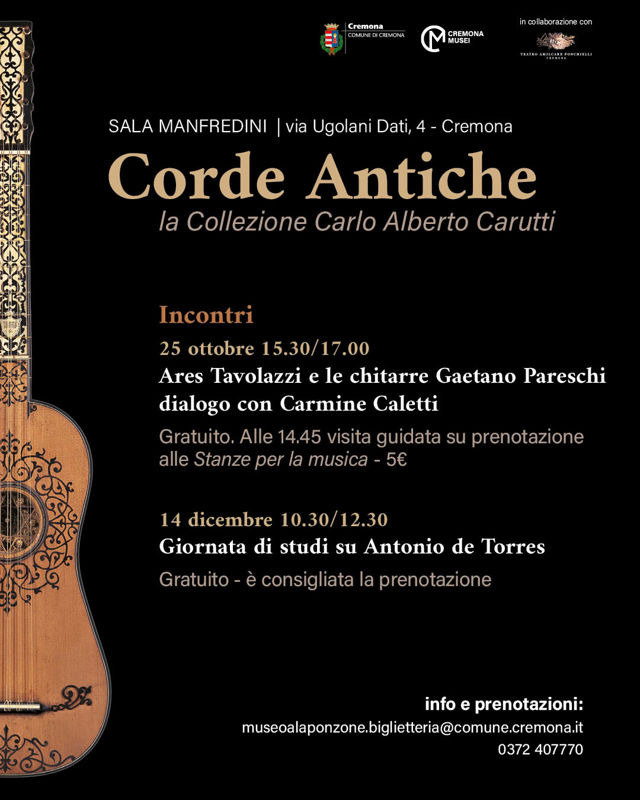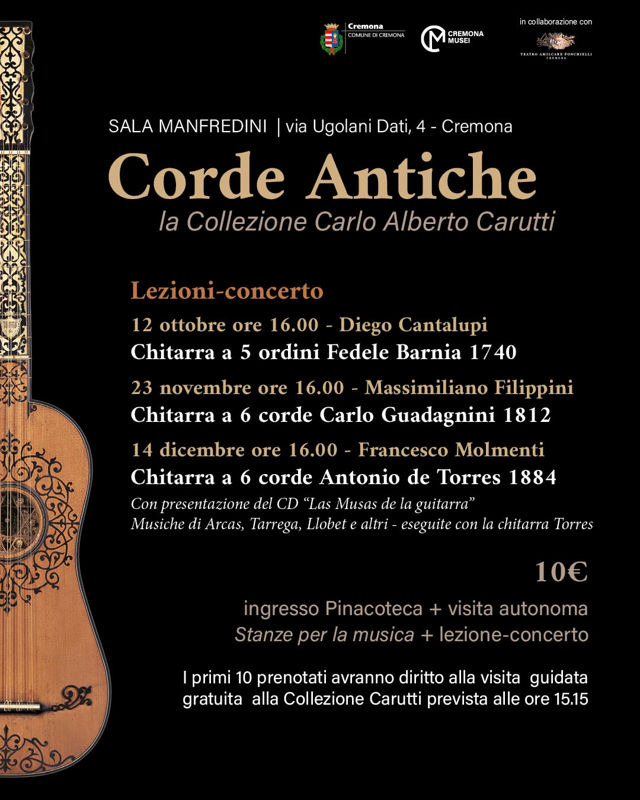 Cremona Musei in collaborazione con il Teatro A. Ponchielli vuole valorizzare questa prestigiosa collezione di strumenti antichi, in comodato al Museo Civico Ala Ponzone di Cremona, con una serie di appuntamenti, che vedranno protagonisti, non solo artisti, ma anche alcuni tra i più significativi strumenti della raccolta, con un focus speciale sull’evoluzione della chitarra dalla seconda metà del Settecento alla fine dell’Ottocento.
