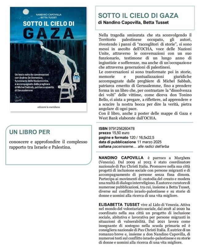 Ad accompagnare l'intervento di don Capovilla sarà il libro Sotto il cielo di Gaza, un'opera nata dalle conversazioni con Andrea Di Domenico, funzionario delle Nazioni Unite a Gaza, espulso nell'aprile 2024 dal governo israeliano. Il volume è impreziosito dalle preghiere di Michel Sabbah, patriarca emerito di Gerusalemme, e rappresenta una testimonianza viva, cruda ma necessaria, su una delle crisi più drammatiche del nostro tempo.
