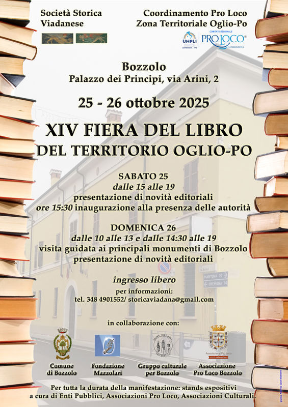 La Società Storica Viadanese e il Coordinamento Territoriale delle Pro Loco organizzano, per sabato 25 e domenica 26 ottobre, la XIV edizione della Fiera del Libro del Territorio Oglio-Po, che si svolge per la prima volta a Bozzolo, nello storico Palazzo dei Principi. L’iniziativa è realizzata con il supporto del Comune di Bozzolo, della Pro Loco, del Gruppo Culturale “Per Bozzolo” e della Fondazione Mazzolari.