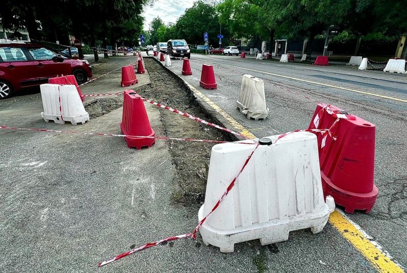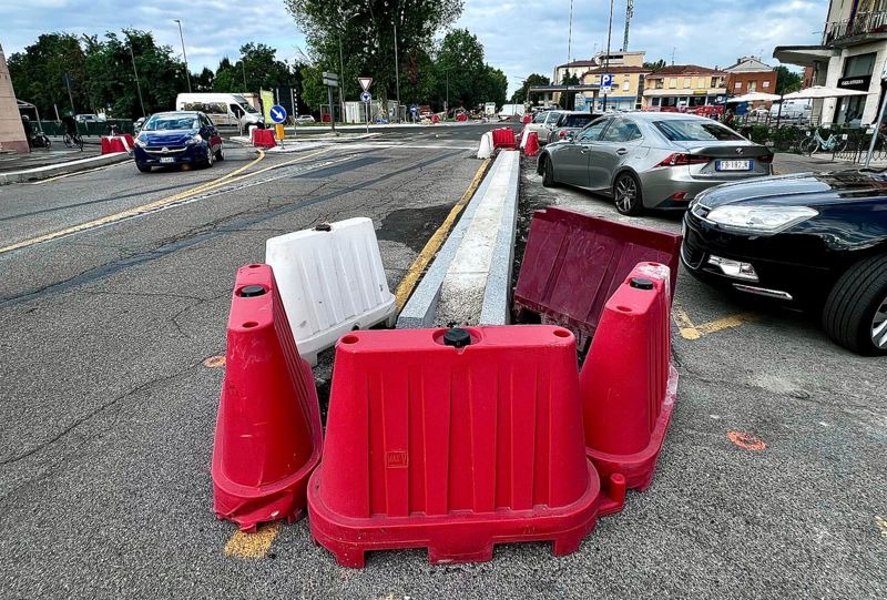Ecco l'ultimo tratto di viale Po senza le siepi. Rimosse per realizzare isole di canalizzazione verso il parcheggio; il cantiere su Largo Moreni prosegue fino a fine mese