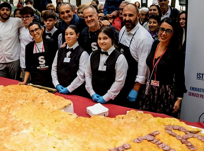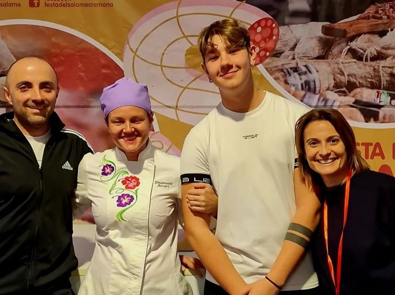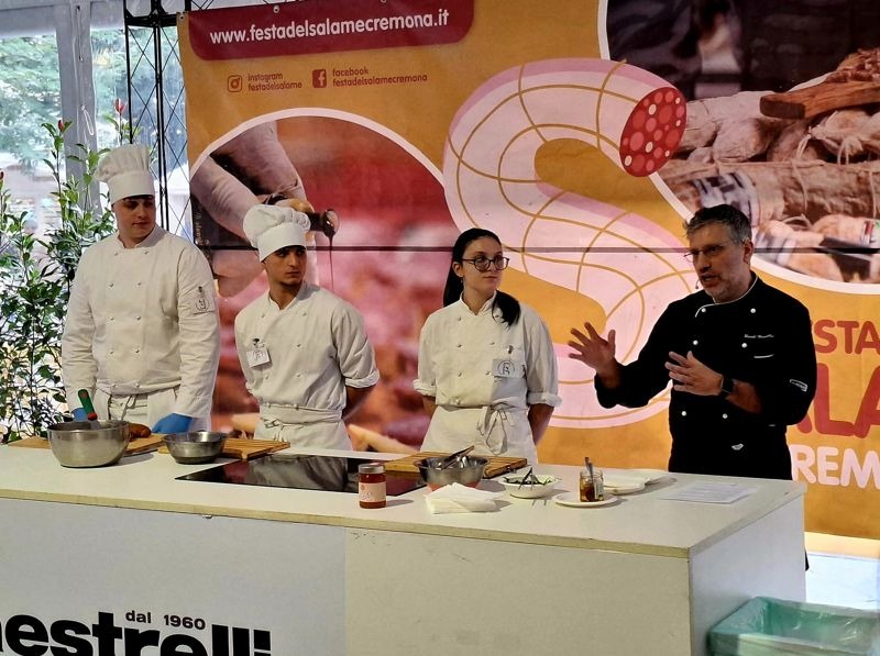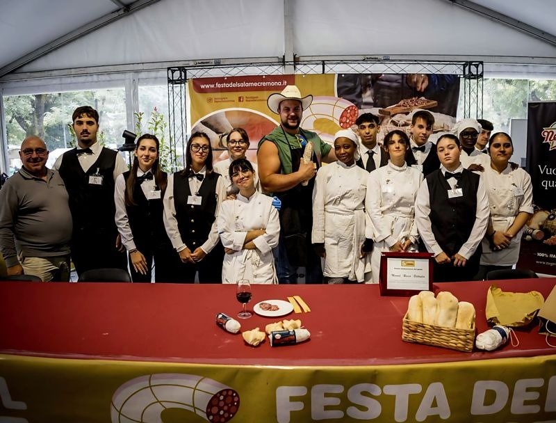 Oltre che di calorie, l’edizione 2025 della Festa del Salame ha permesso a studenti e docenti dell’istituto “Luigi Einaudi” di fare il pieno di conoscenze, esperienze ed emozioni. La scuola di via Bissolati, diretta da Nicoletta Ferrari, è scesa in campo con tre dei suoi cinque indirizzi di studio, per affiancare gli appuntamenti di punta e per essere la protagonista di svariati momenti a lei dedicati. La manifestazione ha coinvolto le hostess e gli steward del Turismo per l’accoglienza dei visitatori, i giovani dei Servizi per la Sanità e l’assistenza sociale per l’intrattenimento dei bambini ed ovviamente i futuri cuochi ed addetti di sala dell’Enogastronomia ed ospitalità alberghiera, per deliziare il palato dei più golosi, al PalaSalame, il quartier generale, situato presso i giardini pubblici di piazza Roma. Dopo il taglio del nastro, gli alunni hanno avuto il loro bel da fare con le indicazioni per i turisti, i laboratori creativi per i più piccoli ed ovviamente le preparazioni a base del re degli insaccati nostrani, proposto in tutte le salse, dimensioni e fogge, persino in forma di mega violino Stradivari e di Torrazzo, le due installazioni assemblate con l’aiuto dell’insegnante Cristian Fusco, non nuovo a tali fatiche ciclopiche. Non sono inoltre mancati gli sconfinamenti mirati alla scoperta delle varianti dolci, come quella targata Sperlari, di cui il professor Dionisi Zoppi ha guidato una degustazione di successo, per poi concedersi una truccatissima sfida a braccio di ferro con Manuel “Roccia” Battaglia, campione di arm wrestling ed influencer bresciano, invitato all’evento in qualità di Ambasciatore del Gusto. Il pubblico è andato in estasi per gli show cooking di Massimiliano Ruscelli, che si è cimentato in panini e bruschette gourmet a tema, dai nomi evocativi. Nei “Sapori d’Autunno”, in “Sweet Relax” ed in “Eleganza ed Armonia”, il salume per antonomasia si è sposato con vari tipi di mostarda ed ancora con formaggi, erbe aromatiche, zucca di stagione e persino cioccolato fondente, creando così una miscela esclusiva e ricercata. A questo proposito, sarebbe stato interessante sentire il giudizio insindacabile di Franchino Er Criminale, che, l’estate scorsa, ha fatto furore sul web, dando un voto a tanti locali cremonesi del settore. L'evento autunnale ha suscitato la curiosità delle reti Rai e Mediaset, che, nei loro programmi televisivi, hanno mandato in onda spezzoni della kermesse, animata dagli allievi di cucina e salabar e dai compagni degli altri corsi, che sono stati accompagnati dalle referenti Annalisa Prisco, Valentina Terreni, Letizia Spinello e Nicoletta Trovato.