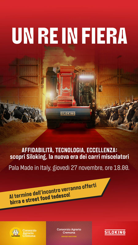 Giovedì 27 novembre, giornata inaugurale della fiera, il Consorzio proporrà un evento speciale all'interno dell'area fieristica, presso il Pala Made in Italy per presentare ufficialmente la nuova collaborazione con SILOKING, azienda tedesca leader nei carri miscelatori. Grazie a questo accordo, il Consorzio Agrario è diventato rivenditore ufficiale del marchio in sei province lombarde (Cremona, Mantova, Lodi, Bergamo, Brescia e Milano). Durante l'incontro, i rappresentanti del Consorzio e di SILOKING approfondiranno le caratteristiche delle macchine di ultima generazione, evidenziando i vantaggi in termini di efficienza, sostenibilità e applicazione pratica nelle stalle moderne, con la testimonianza diretta degli allevatori.
