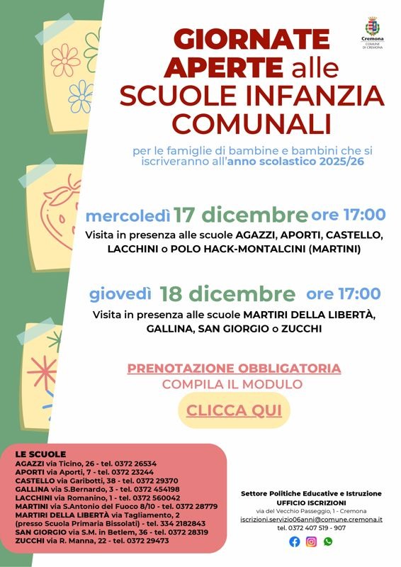 Le giornate aperte si terranno mercoledì 17 dicembre, alle 17:00, per le scuole infanzia Agazzi, Aporti, Castello, Lacchini e Martini, e giovedì 18 dicembre, sempre alle ore 17:00, per le scuole infanzia Gallina, Martiri della Libertà, San Giorgio e Zucchi. Tutti i genitori interessati devono prenotarsicompilando il modulo google disponibile al seguente indirizzo: