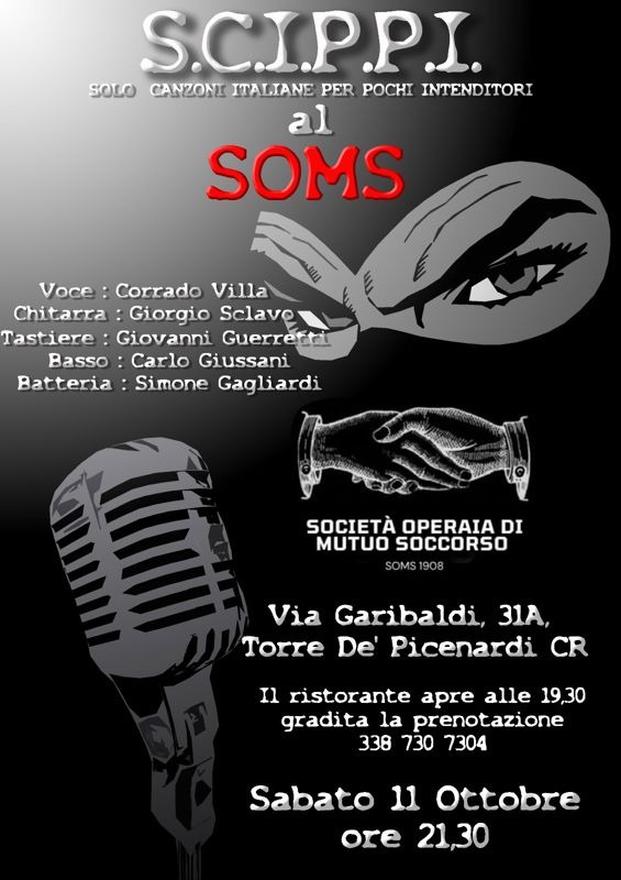 Gli SCIPPI sabato 11 ottobre 2025 saranno protagonisti alla SOMS – Società Operaia di Mutuo Soccorso di Torre de’ Picenardi, in via Garibaldi 31A. L’appuntamento è fissato per le ore 21.30, ma già dalle 19.30 sarà possibile cenare presso il bar interno, che aprirà le porte al pubblico in attesa del concerto (si consiglia la prenotazione al numero 338 730 7304).