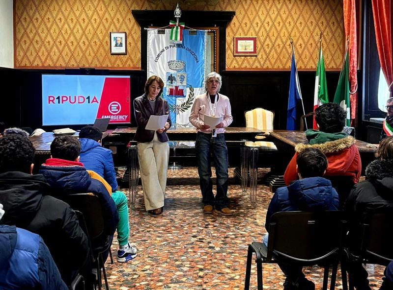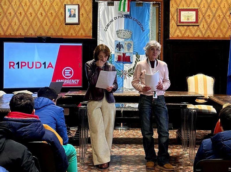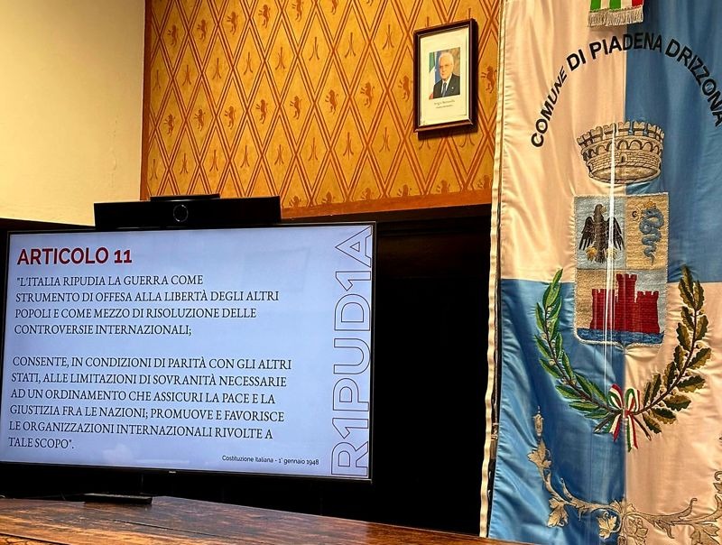 Sabato mattina, presso la sala consiliare del Comune di Piadena Drizzona, gli alunni di terza media dell'Istituto Comprensivo “G. M. Sacchi” hanno assistito ad una lezione fuori sede mirata a promuovere la cultura della pace tra le nuove generazioni. L’amministrazione locale ha infatti aderito alla campagna Emergency “R1PUD1A”, portata avanti, sul nostro territorio, dalla sezione cremonese e cremasca dell’O.N.G., fondata da Gino Strada nel 1994, con lo scopo di garantire cure mediche e chirurgiche gratuite alle vittime di conflitti bellici, mine antiuomo e povertà. Gli studenti, gli insegnanti ed il dirigente scolastico Umberto Parolini sono stati accolti in piazza Garibaldi dalla sindaca Federica Ferrari, accompagnata dal vice Giordano Lazzari, dagli assessori Andrea Volpi e Marica Dall'Asta e dai consiglieri Luca Ziletti e Mauro Garatti. Con loro, c’erano inoltre il primo cittadino di Voltido Giorgio Borghetti (che ha sposato la medesima iniziativa) e Luciano Di Cesare, a nome della minoranza. Sul balcone del palazzo municipale, è stato quindi fissato uno striscione, in cui campeggia la scritta “Il Comune di Piadena Drizzona R1PUD1A la guerra”, con un rimando diretto, anche grafico-numerico, all’articolo 11 della Costituzione, entrata in vigore, nel 1948, in un’Italia alle prese con la difficile ricostruzione successiva alle devastazioni della Seconda Guerra Mondiale. A parlare ai ragazzi sono state le volontarie Rosella Mazzocchi e Maria Floridia, che hanno proiettato video sull’attività dell’associazione umanitaria con cui collaborano e fornito dati estremamente significativi ed allarmanti, secondo i quali, a morire nei contesti bellici mondiali, sono più i civili (93%) dei militari (7%). Venerdì 20 febbraio, si terrà un ulteriore incontro per la cittadinanza sulle stesse tematiche.