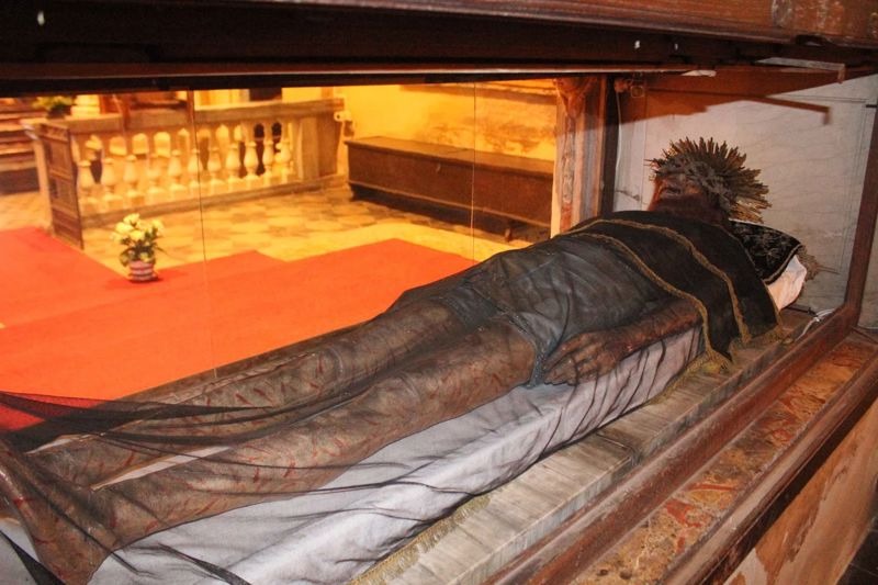 Si tratta del Cristo venuto dal Po, arrivato proprio da Cremona. Una statua in tutto e per tutto simile ad una figura umana, anche al tatto, visto che il materiale con cui è realizzato, il cuoio, sulle prime, può appunto far pensare ad un essere umano autentico. Quello che lo riguarda può essere definito un giallo storico. Una vicenda in cui, più che mai, storia e leggenda si fondono. Si dice che a farlo arrivare sulla sponda emiliana fu, nel XV secolo, una piena del Po. Il fiume impetuoso, stando sempre alle narrazioni che da tempo vengono tenute vive dalla memoria popolare, distrusse una chiesa cremonese, portandosi via, quindi, anche questa statua del Cristo Morto. La “corsa” sulle acque finì a Vidalenzo di Polesine, sulle rive del fiume naturalmente. Immediatamente la gente locale lo scambiò per un cadavere autentico. Una volta avvicinato ecco che la verità si materializzò: quello che era davanti a tutti era un simulacro, integro, del Salvatore rappresentato dopo la crocifissione. Subito divampò una diatriba, tra le opposte rive del Po, circa il luogo in cui il misterioso Cristo doveva essere portato.