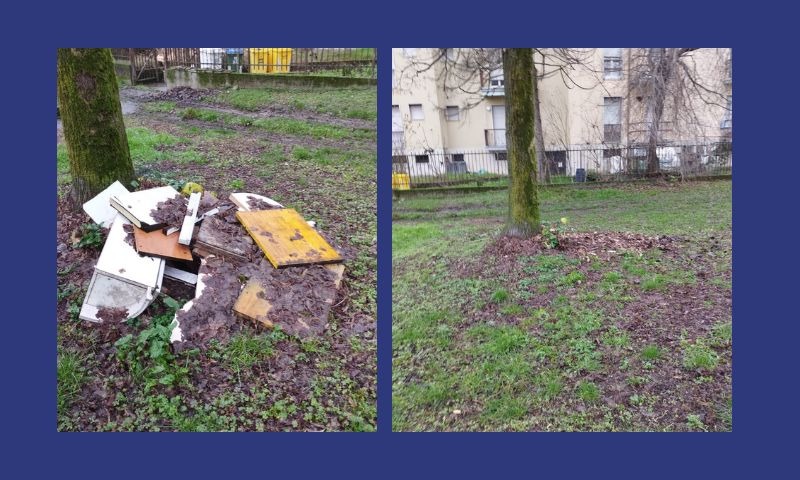 Alla lista degli interventi degli ultimi giorni, va aggiunto anche il recupero del materiale legnoso (pensili da cucina e sedie) che era stato abbandonato nel giardino di viale Concordia, portato finalmente in discarica.