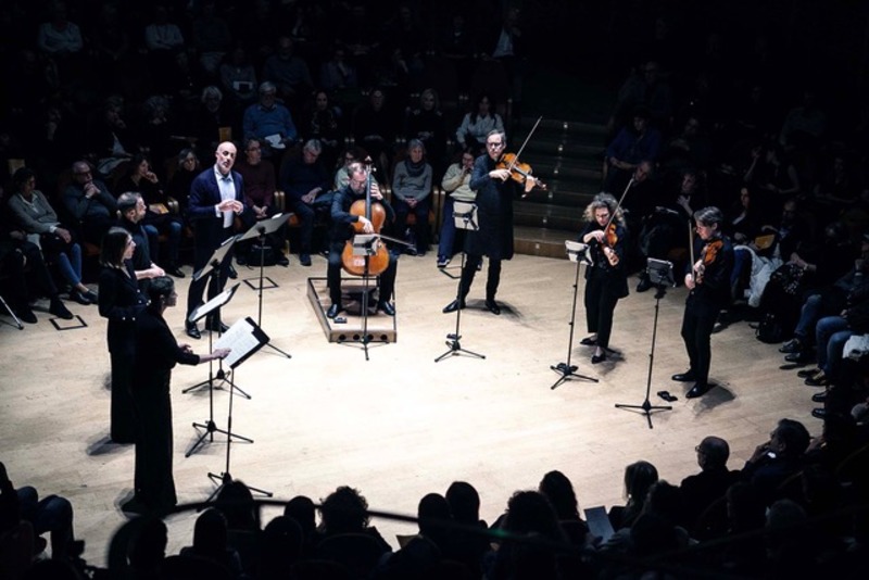 Molto convincente e d’effetto l’esecuzione in cui le voci si sono rincorse nelle imitazioni con il quartetto d’archi in un gioco di specchi in cui era quasi impossibile distinguere il timbro strumentale da quello vocale, complici i suoni fissi e filati, privi di vibrato, quasi scolpiti nel ghiaccio, del quartetto d’archi.