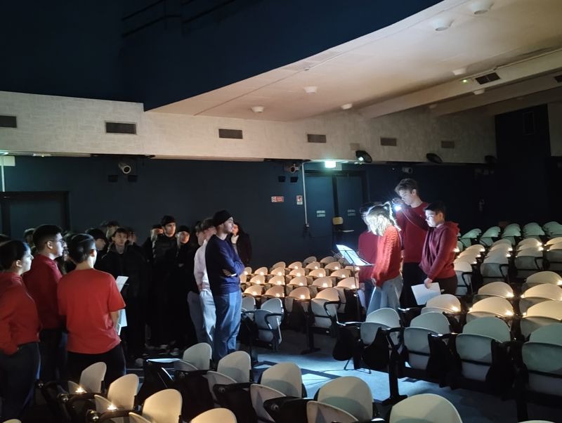 In un' atmosfera raccolta fatta di luci e ombre in aula magna, con tante candele in memoria delle vittime, gli studenti ripetono i loro testi per un pubblico di piccoli gruppi classe che si alternano per tutta la mattina.