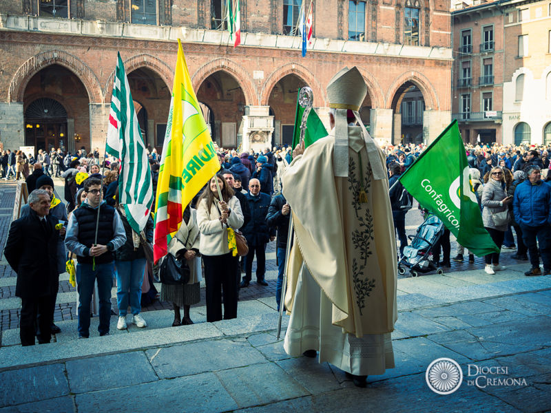 Alla fine della liturgia don Claudio Anselmi, dopo aver ringraziato il vescovo, ha chiosato ricordando che «le bandiere che tra poco riprenderanno a sventolare ci dicono storia, identità e appartenenza. Se Giubileo è appello, celebrazione e anche consegna, oggi le associazioni di categoria dei lavoratori della terra e del mondo agroalimentare accolgono l’appello del Giubileo e vogliono, coordinati dalla Pastorale sociale e del lavoro, iniziare un processo che le vedrà unite con fraternità e spontaneità per far proprie le indicazioni della Dottrina sociale e declinarle in relazione alla vocazione associativa di cui sono portatori custodi e garanti per una sempre più dichiarata profezia di umanità come Chiesa per il bene di tutti». (www.diocesidicremona.it)
