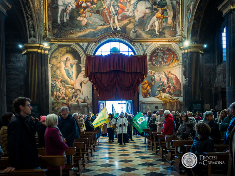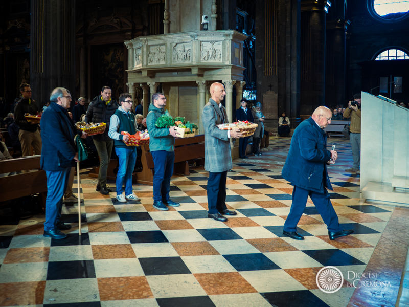 Prima dell’ingresso in Cattedrale nell’androne del palazzo vescovile si era tenuto un momento di riflessione sul tema della 75ª Giornata nazionale del Ringraziamento guidato da don Claudio Anselmi, recentemente nominato consigliere ecclesiastico di Coldiretti Cremona. Il sacerdote ha così introdotto i temi della Giornata, al titolo “Giubileo, rigenerazione della terra e speranza per l’umanità”, leggendo il testo firmato dalla Commissione episcopale della CEI per i problemi sociali e il lavoro. Anselmi ha riproposto così le esortazioni dei vescovi italiani a restituire “dignità a tanti fratelli, soprattutto immigrati, che vengono sfruttati nel lavoro dei campi”, a garantire il “riposo della terra”, in un’ottica agroecologica e a riscoprire le buone pratiche: “Possiamo abitare la terra dando speranza anche alle generazioni future, sapendo che il Signore benedice chi si prende cura delle sue creature”.