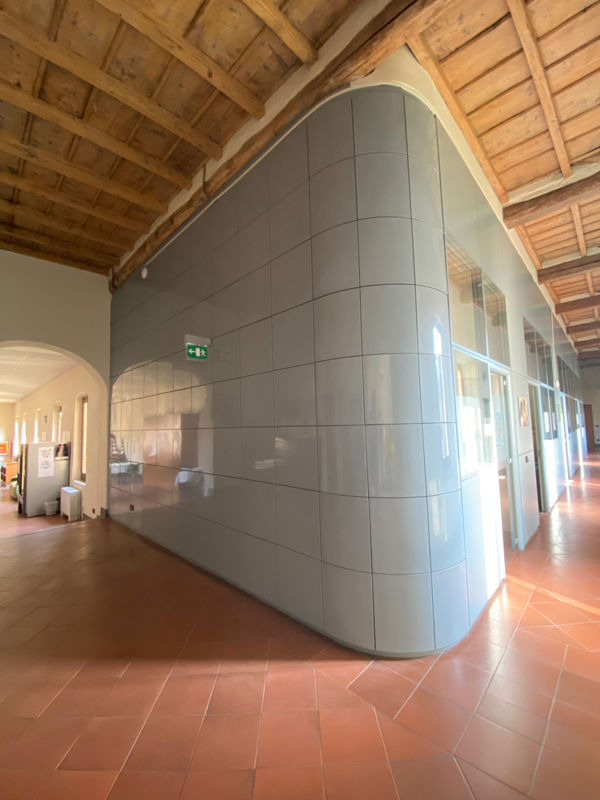 La parete misura circa m 5 x 4 (h) ed è rivestita di pannelli grigi in materiale semilucido della misura di circa cm 50 x 50, distanziati tra di loro da una fuga di circa 1 cm.