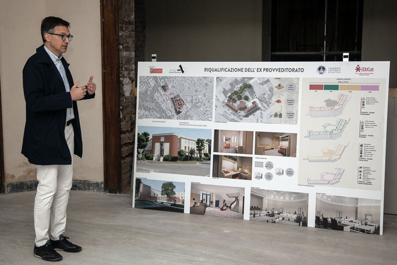 L'ex Provveditorato diventa uno studentato modello. La visita del rettore della Cattolica Elena Beccalli con il Cavaliere Arvedi e la moglie che hanno voluto e finanziato il recupero