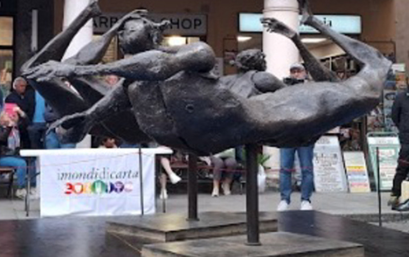 L'opera d'arte "La serie dei Nuotatori" in piazza Duomo vuol dire che a Crema è tempo del Festival I mondi di carta...