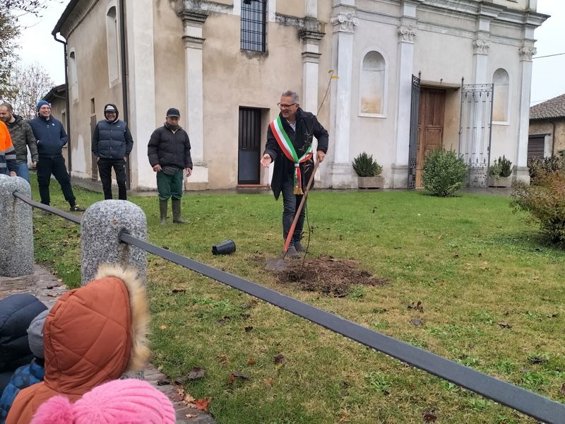 Infine, tutti sul piazzale del Comune per seguire la messa a dimora di un alberello nel prato davanti alla chiesa parrocchiale di San Giorgio, dove il sindaco ha preparato la buca, sistemato la pianta e quindi ricoperto di terra le radici, dando l'esempio dell'importanza di questo semplice ma significativo gesto.