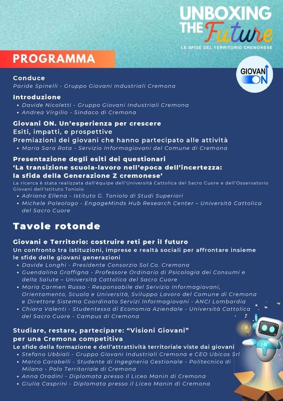In particolare, un affondo sarà dedicato ai risultati della ricerca La transizione scuola-lavoro nell’epoca dell’incertezza: la sfida della Generazione Z cremonese, promossa dal Gruppo Giovani Industriali di Cremona in collaborazione con l’Informagiovani del Comune di Cremona e realizzata dall'équipe dell'Università Cattolica del Sacro Cuore e dell'Osservatorio Giovani dell'Istituto Toniolo.