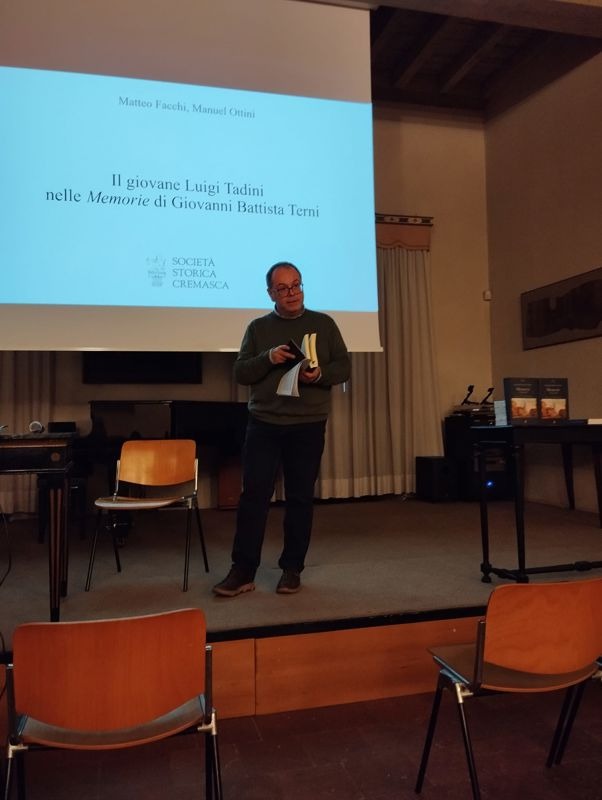 Martedì 30 settembre 2025 nella prestigiosa Sala degli affreschi dell’Accademia Tadini di Lovere, Matteo Facchi e Manuel Ottini della Società Storica Cremasca, hanno tenuto una conferenza dal titolo "Il giovane Luigi Tadini nelle Memorie (1759-1787) di Giovanni Battista Terni". Spunto per l’evento è stato il volume, recentemente pubblicato dalla Società Storica Cremasca: "Giovanni Battista Terni. Memorie 1759-1787", a cura di M. Ottini, Crema, Conte Terni de’ Gregory 1001, 2024.