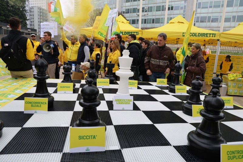 In piazza è stata allestita una maxi scacchiera per rappresentare la situazione in cui si trovano le aziende agricole. L’agricoltura lombarda, raffigurata dalla pedina del re bianco, è accerchiata da numerose pedine nere, simbolo delle minacce che mettono sotto scacco la sua sopravvivenza: dalla concorrenza sleale ai prezzi sottocosto, dagli eventi climatici estremi alla fauna selvatica fuori controllo, dai risarcimenti lumaca al consumo di suolo fino all’incubo di un nuovo shock energetico.