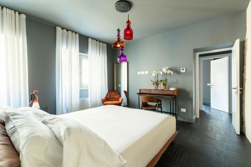 Gli interni, ispirati alla tradizione delle forme geometriche anni ’30, presentano pavimentazioni in parquet trattato con resine, colori scuri a effetto “scatola”, carte da parati scenografiche e finiture che spaziano dalle tonalità dell’ottone brunito al platino, dal peltro all’argento invecchiato, fino al ferro blue laser. Ogni appartamento è concepito come un ambiente dal carattere indipendente, pensato per offrire all’ospite un’esperienza sempre diversa, mai banale.