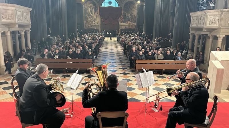 Il Concerto di Natale può essere anche molto altro rispetto a una mera serie di canti natalizi, come avviene nella più consolidata tradizione. Lo è stata l’esibizione andata ‘in scena’ in Cattedrale in questa domenica d’Avvento. Protagonisti: Fausto Caporali maestro e organista titolare della chiesa madre cremonese e il prestigioso ensemble degli ottoni dell’Opera della Scala: Gianni Dallaturca e Nicola Martelli (tromba), Roberto Miele (corno), Giuseppe Grandi (trombone) e Alberto Tondi (bassotuba).