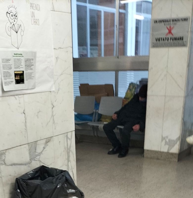 La notte è la più difficile, con le temperature che crollano, il buio e la solitudine, una solitudine a cui però queste anime sono abituate: sono i senza tetto, uomini e donne che non hanno altro che pochi stracci e qualche borsa riempita di chissà cosa. L'inverno non è amico di chi non ha una casa, di chi non ha nessuno a cui chiedere un aiuto e forse non ha nemmeno più la voglia di chiederlo. Ma la notte bisogna pur passarla in qualche modo e in un luogo che almeno non sia così gelido: ecco che le sale d'attesa dei reparti dell'Ospedale Maggiore di Cremona diventano un rifugio dove trovare una sedia su cui accasciarsi, almeno per non dormire sdraiati per terra, sul freddo pavimento di qualche portico. Uomini come ombre, che non alzano nemmeno lo sguardo, abbottonati nei pesanti cappotti e chiusi nel proprio mondo fatto di stenti, di espedienti e di solitudine.