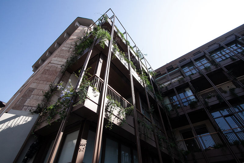 Il progetto di Palazzo Corteverdi porta la firma dell'archistar Stefano Boeri ed è caratterizzato da un'importante presenza di verde, sia nel giardino privato che, appunto, nella parte strutturale dell'edificio, con queste grandi fioriere che incorniciano logge e terrazze interne, nei quali sono stati messi a dimora piante e fiori che completano la suggestiva scenografia a foggia di giardino pensile.