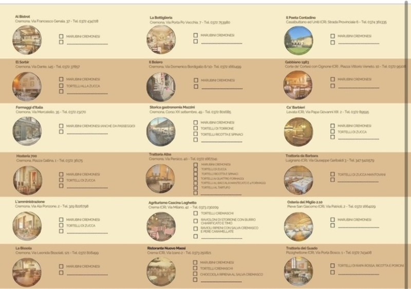 Ristorante Al Bistrot Formaggi & Salumi d'Italia, La Locanda del Gusto, Ristorante & Pizza Gourmet Trattoria Alba Cremona, Trattoria La Resca Trattoria del Guado Enogastronomia Mazzini, Hosteria 700, Ca' Barbieri, Buddha Bar Il Loto, Agriturismo Cascina Loghetto, Agriturismo Corte dei Peri, Trattoria El Sorbir, Osteria La Bissola, Agriturismo La Torre, Trattoria da Barbara, Lido Ariston Sales, Gabbiano1983 - Specialità d'oca e grandi vini, il Poeta Contadino è Osteria del Miglio. Vinca il migliore.