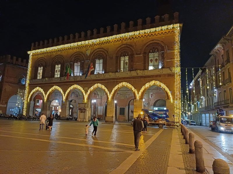 La seconda immagine è quella che si ammira -si fa per dire- sotto il portico del palazzo dei Militi, in piazza del Comune. Non è certo il suo posto, e si vede. In precedenza era stato collocato nel cortile di palazzo Ala Ponzone, in corso Vittorio Emanuele. In origine era un trofeo marmoreo che sovrastava la porta Margherita (o Romana), prima del suo abbattimento, alla fine del 1908, in fondo a corso Vacchelli (già corso di porta Romana, quondam corso di porta Margherita).