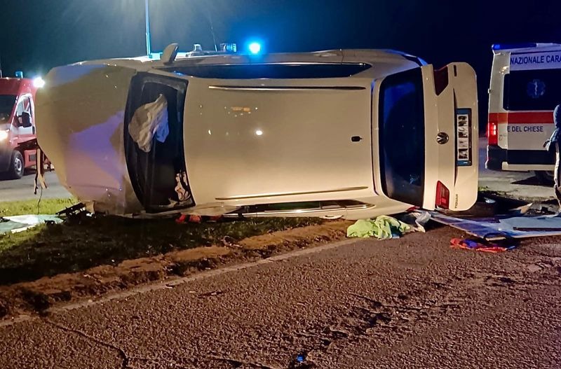 Verso le 17.30 due auto si sono scontrate violentemente, per cause in corso di accertamento: quattro le persone coinvolte nello schianto, a seguito del quale una delle due auto, una Peugeot con a bordo tre persone, ha terminato la sua corsa nella scarpata a lato della strada mentre l'altra, un Wolkswagen Tiguan guidata da una donna, è finita ribaltata su un fianco al centro dell'aiuola spartitraffico.