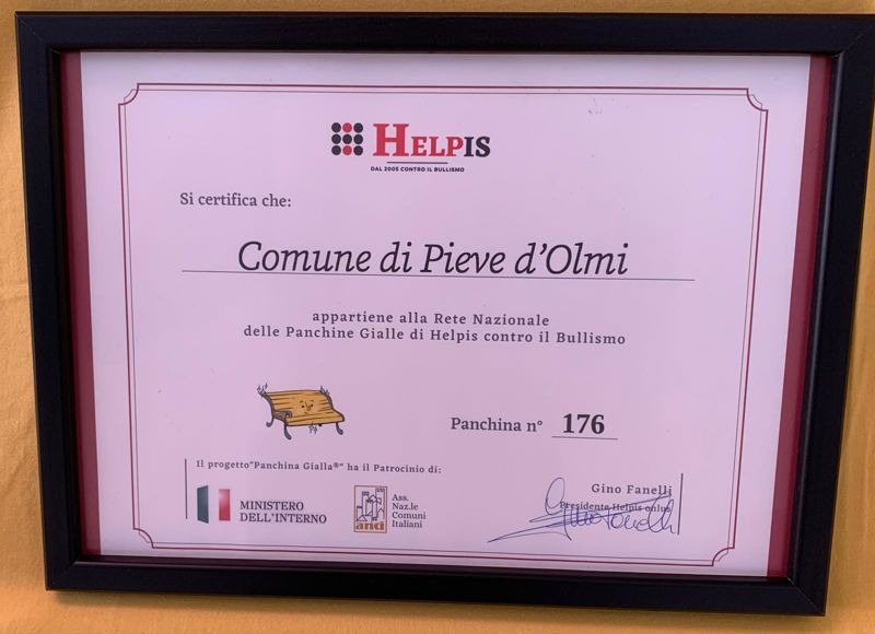 La panchina — numerata n. 174 — fa parte del progetto nazionale promosso da Helpis, realizzato con il patrocinio del Ministero dell’Interno e dell’ANCI.