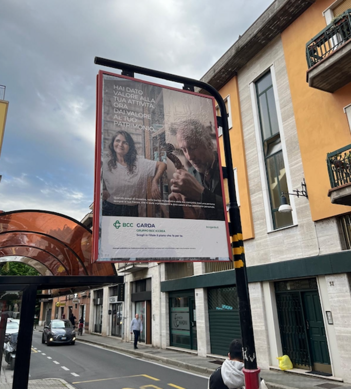 Nelle fotografie: un grande murales, un manifesto presente in una filiale ed infine il banner pubblicitario prsente sulle principali testate nazionali