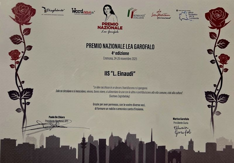 Un riconoscimento per l'impegno profuso durante i tre giorni del quarto “Premio Lea Garofalo”, conclusosi giovedì 26 novembre, è stato consegnato agli studenti dell'I.I.S. “L. Einaudi” dai promotori dell’evento culturale e civile, che ha coinvolto l’intero mondo scolastico, le istituzioni, le forze dell’ordine locali e le associazioni che combattono la violenza sulle donne e che promuovono l’avanzamento della condizione femminile, le pari opportunità ed i diritti umani. Gli allievi hanno ricevuto una formella lignea su cui sono stati incisi il Torrazzo e l’immagine di Lea Garofalo, opera di Alessandra Abbiati, ed un attestato firmato dalla presidente Marisa Garofalo, sorella di Lea. A meritarlo sono stati i ragazzi degli indirizzi Turismo e Enogastronomia ed Ospitalità alberghiera, che, seguiti dagli insegnanti Annalisa Prisco, Valentina Terreni, Cristian Fusco, Massimiliano Ruscelli e Dionisi Zoppi, hanno curato l'accoglienza, presso il Liceo “D. Manin” e la Sala dei Quadri del palazzo municipale ed il rinfresco al “Campus Santa Monica”. La pergamena contiene il ringraziamento "per aver permesso, con le vostre diverse voci, di formare un nobile ed armonico canto d'insieme" ed un pensiero del magistrato e giurista italiano Gustavo Zagrebelsky: “Le idee racchiuse in se stesse si inaridiscono e si spengono. Solo se circolano e si mescolano, vivono, fanno vivere, si alimentano le une con le altre e contribuiscono alla vita comune, cioè alla cultura”. A conservare i due oggetti in ufficio sarà la preside Nicoletta Ferrari, contenta per l'ennesimo successo dei propri alunni, che, in virtù della professionalità sin qui acquisita, hanno saputo gestire in modo apprezzabile i momenti conviviali della manifestazione. Essa si svolge in un luogo ogni anno diverso, con l’obiettivo di diffondere tra i giovani di tutta Italia la memoria ed i valori - della legalità e del contrasto alla criminalità organizzata - indissolubilmente legati alla figura di Lea Garofalo. Originaria di Petilia Policastro, in provincia di Crotone, dove è nata nel 1974, Lea è infatti stata testimone di giustizia e vittima di femminicidio, proprio a causa di tale scelta coraggiosa. Il suo brutale e barbaro assassinio avvenne il 24 novembre 2009, quando Lea fu rapita, torturata, uccisa con un colpo di pistola e poi data alle fiamme dal suo ex compagno Carlo Cosco, con la complicità di uomini, come lui affiliati alla 'ndrangheta. È stata Giuseppina Rosato (docente di Lettere del Liceo linguistico statale e funzione strumentale all’interno dello staff della dirigente Maria Grazia Nolli) ad accogliere ed a concretizzare, in qualità di responsabile nazionale Scuole ed Università dell’ “Associazione Dioghenes” - guidata da Paolo De Chiara - la proposta di un’edizione cremonese del concorso con cui ha sempre collaborato, con la dedizione e la competenza, che la caratterizzano.