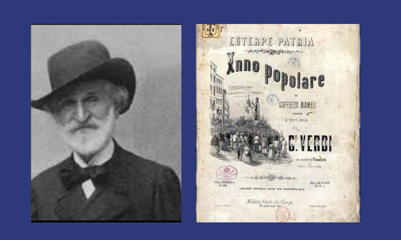 Come poi non ricordare il Verdi appena uscito dal trionfo del Nabucco (1842) e dalla composizione di un'altra opera con spessore politico quale I lombardi alla prima Crociata (1843) [ O Signore dal tetto natio ] e i suoi rapporti con Giuseppe Mazzini e successivamente con Goffredo Mameli. Dalla collaborazione del maestro delle Roncole e del patriottico poeta nacque, nel 1848, l’ Inno militare, Grido di guerra, (Coro maschile a tre voci e pianoforte) che così inizia: Suona la tromba/ ondeggiano le insegne gialle e nere.