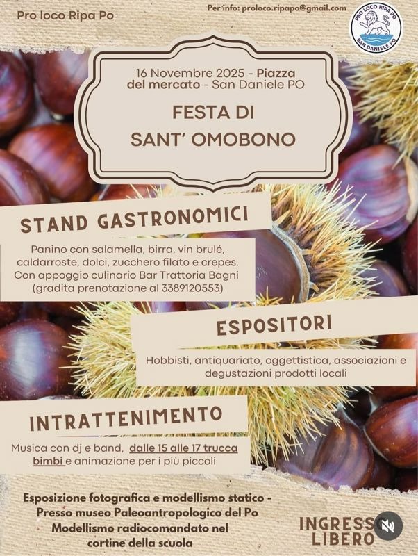 Prossimo appuntamento in occasione della sagra del paese, per Sant'Omobono, in programma domenica 16 novembre nella piazza del mercato del paese, che si animerà alla presenza di bancarelle di hobbisti, antiquariato, oggettistica, associazioni e naturalmente degustazioni di prodotti locali. Non mancherannopoi gli stand gastronomici per uno spuntino o una merenda a base di panino e salamella, birra, vin brulè, caldarroste, dolci, zucchero filato e crepes. Il tutto allietato dall'intrattenimento musicale con dj e band, oltre al classico truccabimbi dalle 15 alle 17; infine presso il Museo Paleoantropologico sarà allestita un'esposizione fotografica, mentre nel cortile delle scuole per tutti modellismo radiocomandato.
