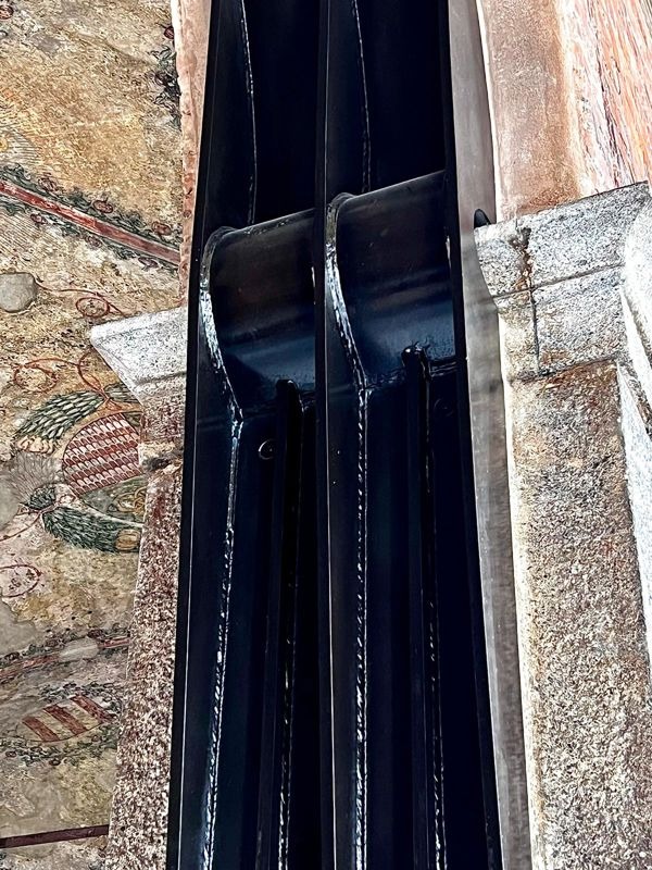 Il restauro appena concluso, promosso per garantire la stabilità delle volte e prevenire rischi strutturali, si presenta quindi come un intervento tanto necessario quanto discusso. Il progetto, approvato dalla Soprintendenza, ha previsto l’inserimento di centine metalliche lasciate volutamente a vista: elementi scuri e lucidi che sorreggono i quattro archi e che, nel complesso, impongono un colpo d’occhio piuttosto marcato.